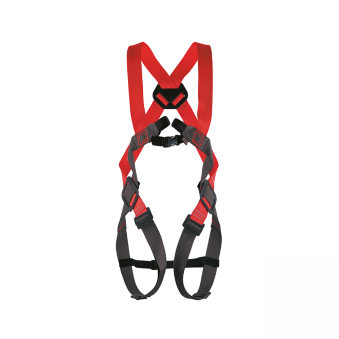 A full body harness with 2 attachment points for fall arrest: 1 sternal double textile loop, 1 dorsal steel ring. Easy Belt (ref.1268) can be attached for work positioning. Steel components. One size fits all.