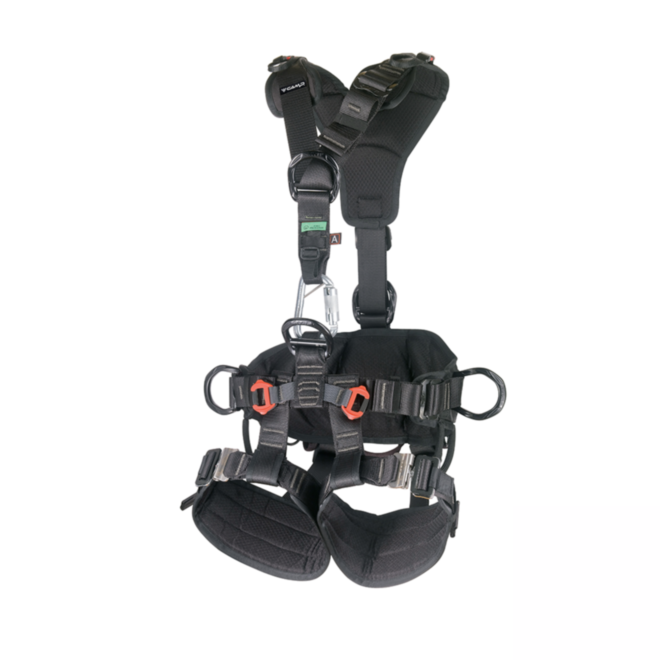 The Access XT is our most robust and supportive rope access harness designed for long periods of suspension. The waist belt and leg loops are made of ergonomic thermoformed padding to offer broad structural support and are connected by optimally spaced connection straps that give the harness a precise and comfortable fit. Ventral attachment features two loops: the upper loop is for attaching a chest harness and chest ascender and the lower loop holds the ventral D-ring for attaching lanyards and rope tools. Supplied with a 3Lock steel carabiner with removable antirotation pin. Equipped with a keeper strap for securing a chest ascender in a streamlined way. ANSI STS automatic buckles on the leg loops. 6 aluminium alloy attachment points: 1 sternal and 1 dorsal for fall arrest with certified load indicators, 1 ventral for suspension, 2 side and 1 back for positioning and restraint. Certified break-away parking loops for lanyards on the shoulders. Equipped with NFC TRACK tag for digital identification. 2 sizes.