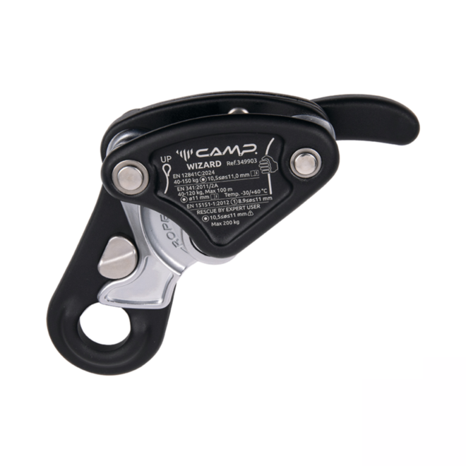 The Wizard is a lightweight, compact auto-braking descender for rope access and rescue. It features a button that allows the cam to be held open for easier insertion of the rope and to remain connected to the user while it is open or while the rope is being inserted or removed. It is equipped with an anti-panic function in the lever that re-engages the cam and locks the rope if the handle is pulled too far where it could lead to unsafe descent speeds. The lever automatically returns to the LOCK position when released.
