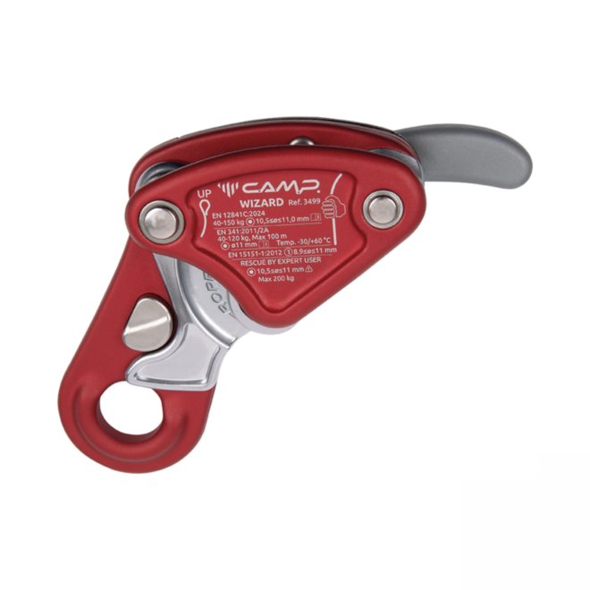 The Wizard is a lightweight, compact auto-braking descender for rope access and rescue. It features a button that allows the cam to be held open for easier insertion of the rope and to remain connected to the user while it is open or while the rope is being inserted or removed. It is equipped with an anti-panic function in the lever that re-engages the cam and locks the rope if the handle is pulled too far where it could lead to unsafe descent speeds. The lever automatically returns to the LOCK position when released.